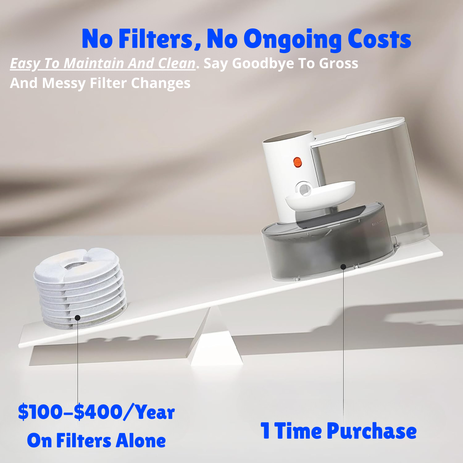 Other fountains rely on expensive filters that need constant replacing—not this one. Our smart fountain skips the filters entirely and still delivers cleaner, safer water, saving you hundreds per year without sacrificing hygiene.